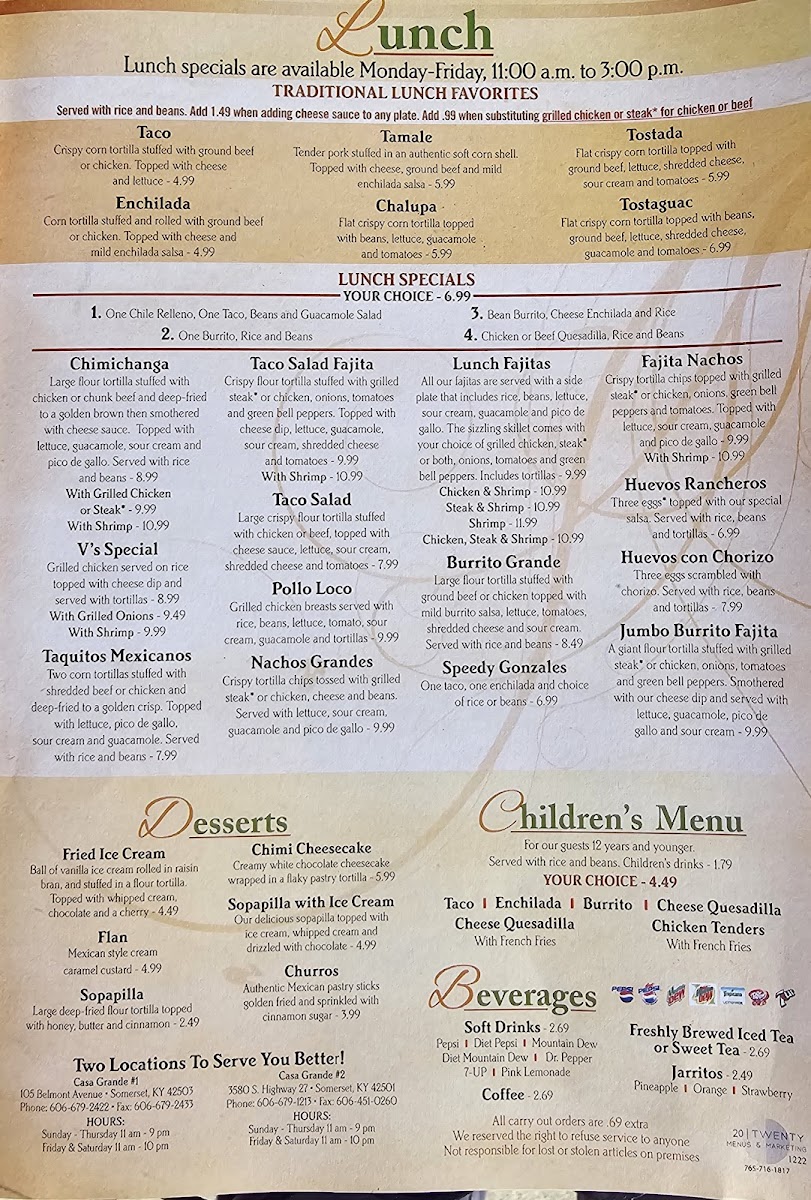 Welcome to Casa Grande 1, a delightful Mexican restaurant nestled in Somerset, KY. Known for its vibrant ambiance, this eatery offers a menu brimming with flavor and authenticity. From mouthwatering appetizers like Buffalo Chicken Wings and Chori Queso Dip to fresh, hearty salads such as the Fajita Salad and Grilled Shrimp Salad, there’s something to tantalize every palate.